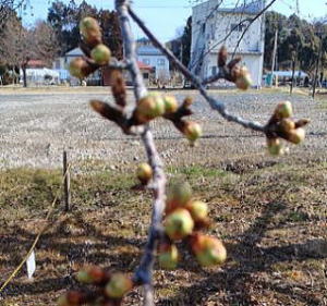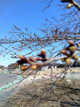 | 3月13日気温が24℃とアイスが欲しくなる温度でした。14日現在の「タイリョウザクラ」のツボミです。少し膨らんできた様子です。 前を通る人が「もう少しだね」と言ってくれます。例年に比べて1週間くらい遅れている気がします。 |