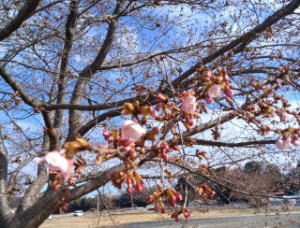| 3月17日現在の「タイリョウザクラ」 つぼみが膨らんでピンク色が見えます。 気温14℃低気圧のせいで風が強く寒く感じます。 しばらく10℃前半の予想が続きます・ |
